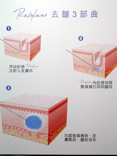透明質酸: 主要針對靜態深坑皺紋如虎紋,嘴角紋和眉心紋等,和Botox可同時使用。