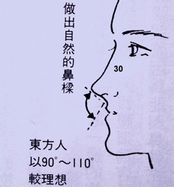 東方人的鼻子多是短,鼻根低,鼻翼大,鼻尖扁,鼻樑如馬鞍狀的低矮曲線,引致面部輪廓過於平坦,缺乏性格。希望鼻子高一點是很多東方人的理想,相反地,歐美人則希望過高的鼻子能低一些,或改善常見的鷹勾鼻。
